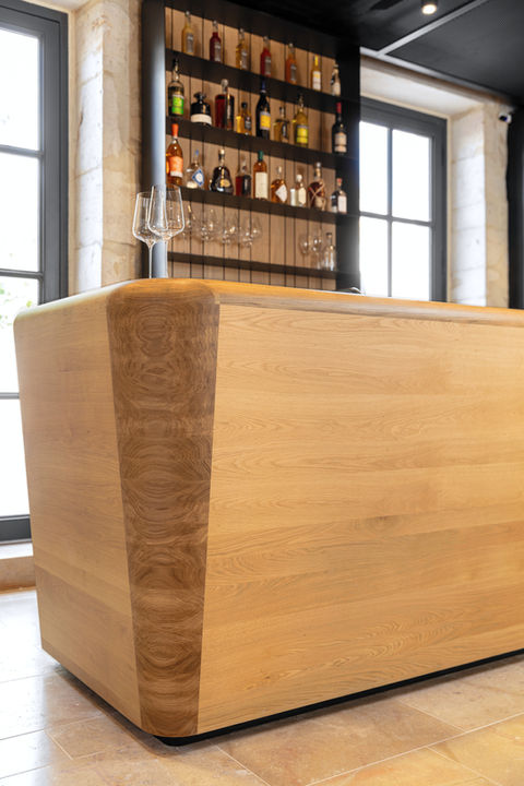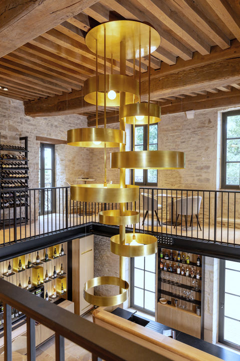 Accompagné du futur sommelier du lieu, le projet a été pensé pour sublimer le vin et sa dégustation, par des ouvrages et pièces hors normes, tels le comptoir entièrement réalisé en bois massif, la passerelle métallique ou encore le lustre en laiton.