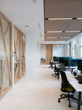 Entièrement restructuré, l'espace a ainsi été pensé tel un patio entouré de bureaux et salles privatives, aux portes et cloisons vitrées sur mesure habillées de claustras bois, conférant au site une forte identité visuelle.